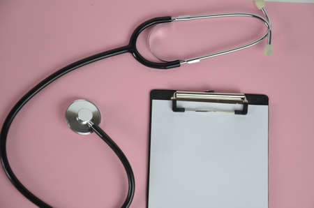 Stethoscope with clipboard and Laptop on desk,Doctor working in hospital writing a prescription, Healthcare and medical concept,test results in background,vintage color,selective focus