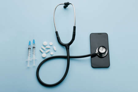 online telemedicine concept, stethoscope and pc keyboard with modern phone, medical app mock up