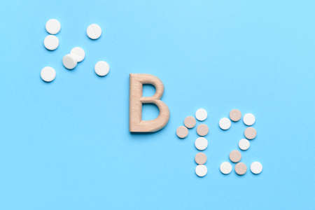 Vitamins in fruits and vegetables and vitamin pills. Top view, flat lay