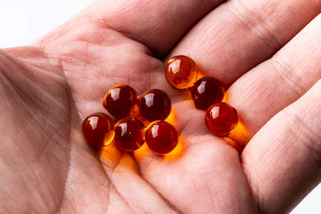 A bunch of Omega-3 capsules in hand. Close-up, top view, high definition product.
