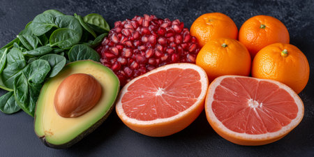 A table adorned with a colorful assortment of oranges, avocado, and spinach.
