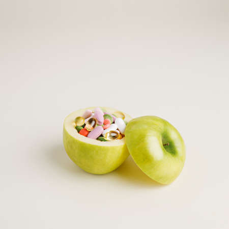Fresh ripe green apple full of colorful vitamin pills and tablets on bright beige background. Creative healthy diet concept.