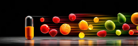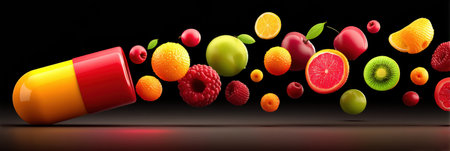 Colorful fruits spin around a vivid vitamin capsule, showing a dynamic feel that emphasizes nutrition and health benefits in an energetic manner.