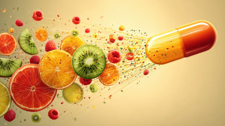 Fruits such as berries, oranges, and limes swirl around a shining vitamin capsule, creating a lively depiction of vitality and nutrition.