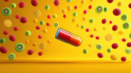 Colorful fruits spin playfully around a red and yellow capsule, creating a lively representation of vitality against a bright yellow background.