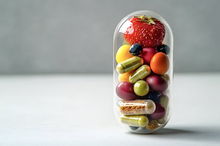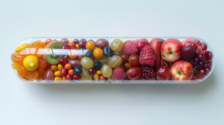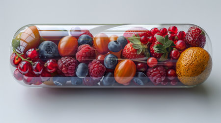 Large transparent pill capsule filled with colorful fruits, berries, and herbal supplements, standing upright on a neutral background, symbolizing holistic health and wellness