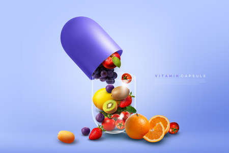 Capsule and a variety of fruits, rich in vitamins and supplements, 3d rendering. 3D illustration.