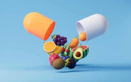 3d rendering of vitamin capsule with fruits and vegetables