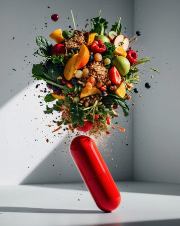 AI Generated. Dynamic Image of a Red Capsule Bursting with Nutritious Foods