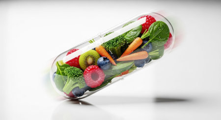 Capsule containing fresh vegetables and fruits with scattered pills and herbs on white.