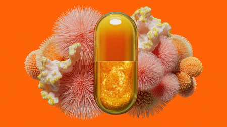 This vivid image showcases a capsule surrounded by abstract microorganisms, reflecting themes of health, wellness, and innovation in medicine.