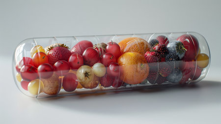 A Colorful fruits and vegetables inside clear capsules arranged in lines, showcasing vibrant colors and detailed textures