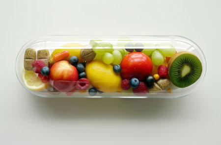 A transparent capsule filled with various fruits and vegetables, including lemons, cherries, and peppers, symbolizing natural health supplements.