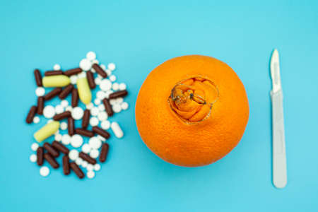 Oranges with a large navel, pills, scalpel on a blue background. concept of medical or surgical treatment of hemorrhoids