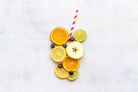 Cocktail concept. Glass of juice made of citrus and fruits with cocktail tube