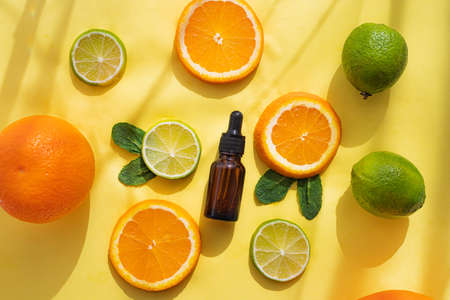 Citrus fruit vitamin c serum oil beauty care in ampullas and bottle, anti aging natural cosmetic.