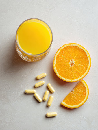 Vitamin C pills lay scattered on a countertop beside a vibrant glass of orange juice and fresh orange slices, suggesting a health-focused morning routine.