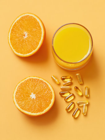 Bright kitchen area features scattered vitamin C pills near a glass of fresh orange juice and halved oranges on a yellow surface.