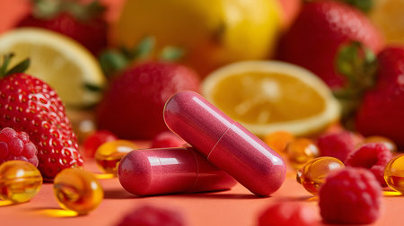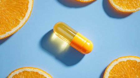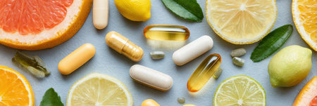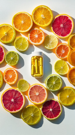 Colorful arrangement of citrus fruits surrounding vitamin capsules on a bright background