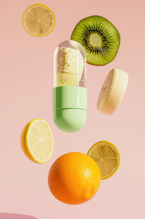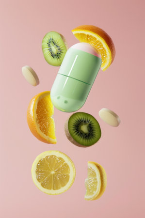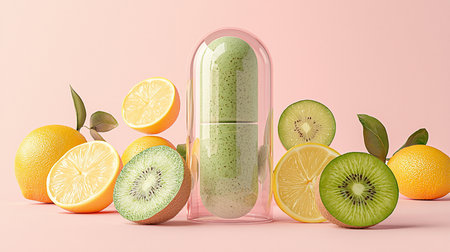 A vibrant, artistic composition showcasing a vitamin capsule surrounded by fresh kiwi and lemon slices. The image conveys health, wellness, and natural ingredients.
