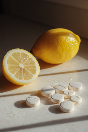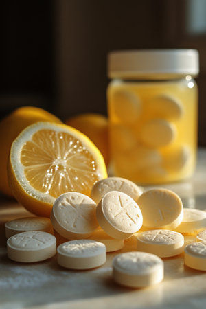 Several round, white tablets are dispersed around fresh lemons, which are halved. The warm light of the afternoon enhances the fresh and vibrant atmosphere of the kitchen setting.