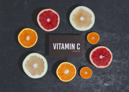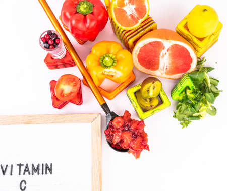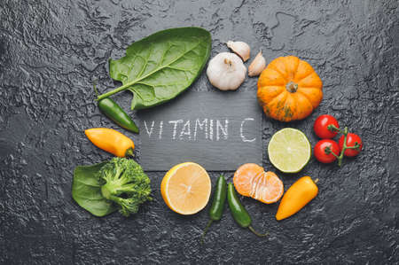 A set of natural products rich in vitamin C ascorbic acid. Healthy food concept. Cardboard sign with the inscription.
