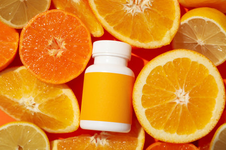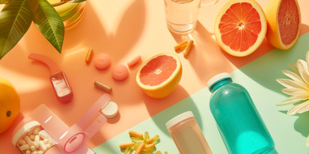 Various dietary supplements and fresh citrus fruits are artistically arranged, showing a focus on health and nutrition.