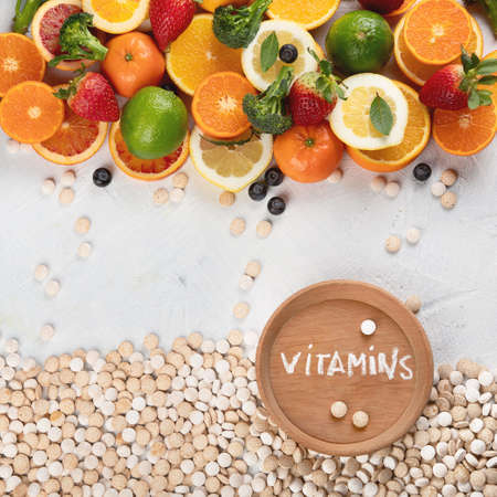 Vitamins in fruits and vegetables and vitamin pills. Top view, flat lay
