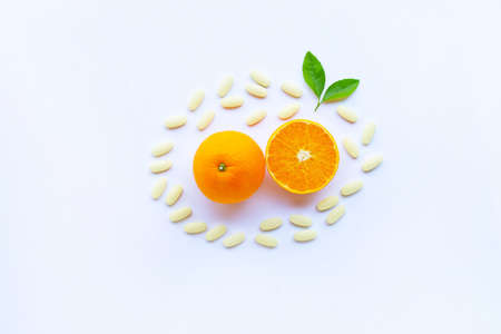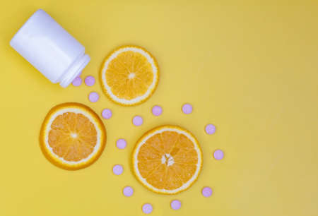 Vitamin C. Orange slices on a bright background and vitamin C tablets. The layout of the branding of a pharmaceutical product.Flat lay. Copy space