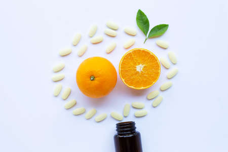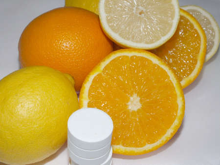 Vitamin concept. Fresh juicy sliced citrus fruits next to vitamin C tablets. Choice between healthy eco food and supplements.