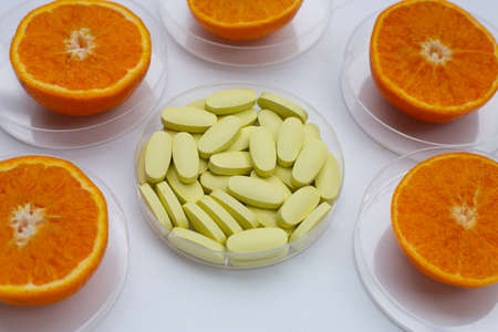 Oranges on a laboratory table with the name of vitamin. Essential vitamins. Doctor in Food test laboratory.
