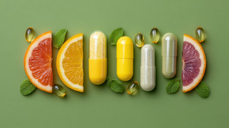 Vibrant arrangement of dietary supplement capsules alongside fresh citrus fruits and mint leaves on a green background, ideal for health-focused content and marketing.