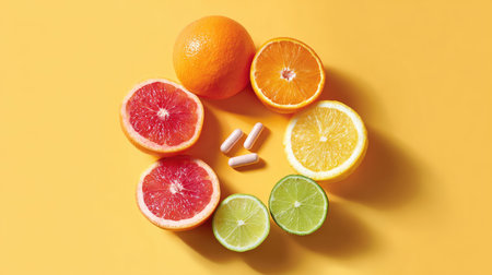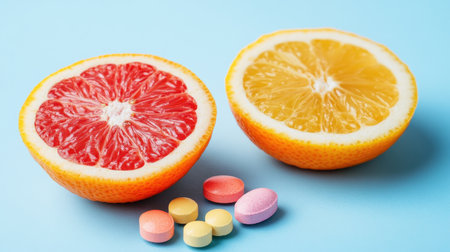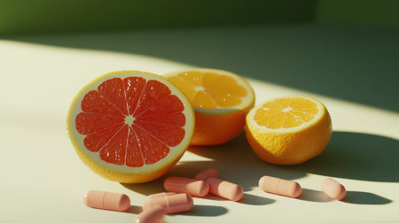 Bright grapefruit halves and golden capsules create a fresh and vibrant display, symbolizing health, nutrition, and the importance of a balanced lifestyle. Perfect for wellness themes.