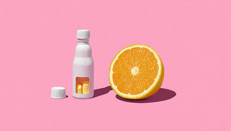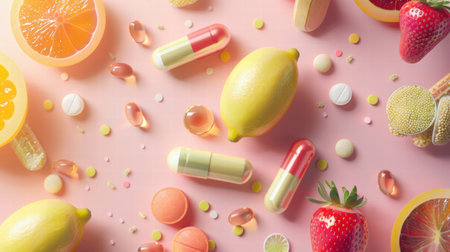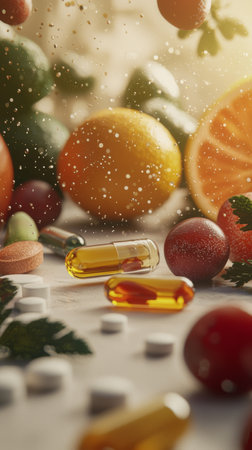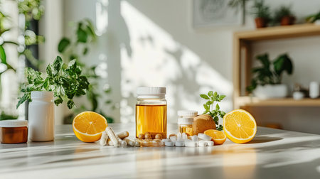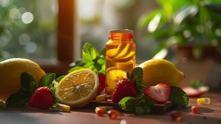 Vibrant display of vitamins and fruits promoting healthy living in a cozy setting