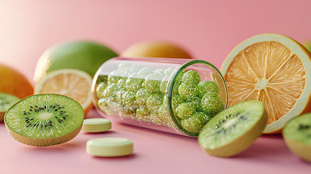 Bright green kiwi halves and vibrant citrus slices surround a clear glass vial containing numerous glitter-coated green supplement spheres, with two green pills nearby.