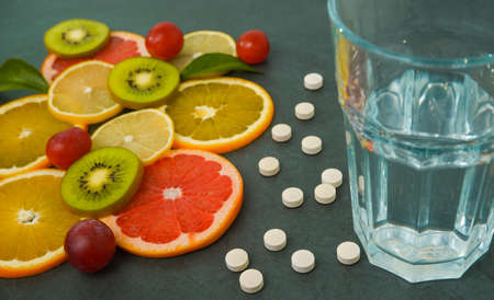 Supplements or healthy natural food? Scattered pills vitamins, Sliced citrus fruits, orange, lemon, kiwi, grapes, glass with water on a stone gray background