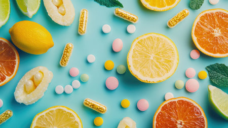 A Citrus fruits, colorful pills, and mint leaves on blue background create vibrant and fresh composition