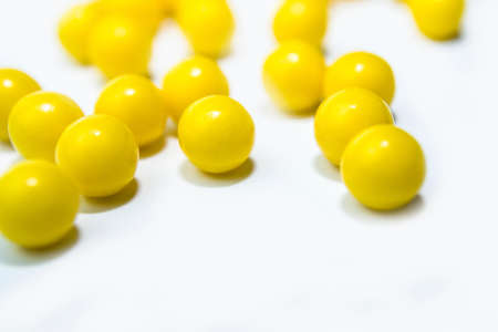 Assorted colorful pills, tablets, capsules and fruits on white background