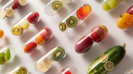 Transparent capsules with fruits. Vitamins, dietary supplements