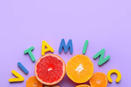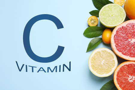 Vitamin C. Cosmetic products and fresh citrus fruits.