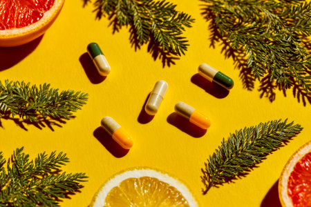 Vibrant herbal capsules nestled among juicy citrus wedges and lush pine sprigs, set against a lively yellow backdrop that exudes freshness and wellbeing.