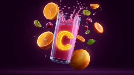 A collection of fruits spins around a vitamin capsule, showcasing a lively burst of color and freshness against a bright background.