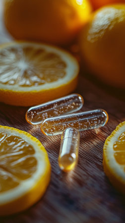 Bright yellow lemons with capsules highlighting health benefits and natural ingredients