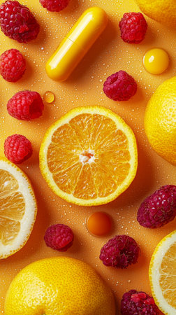 A Colorful vitamins and supplements arranged with fresh fruits like kiwi, orange, grapefruit, and raspberries yellow background