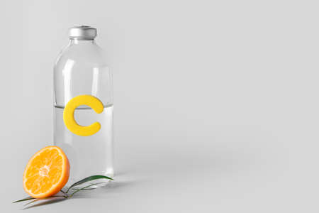 ampoules and Serum with Vitamin C. Organic cosmetics concept. Lemon, orange, grapefruits and ampoules on a light background. Injection of vitamin.Comineral supplement concept. Beauty products.