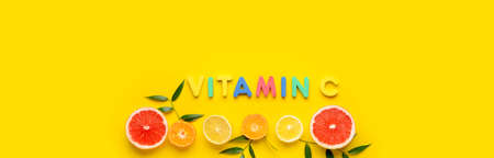 Composition with text VITAMIN C, and different citrus fruits on yellow background