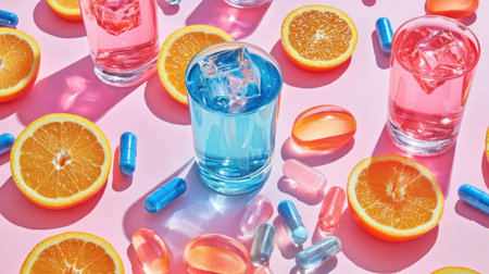 A cheerful summer-inspired arrangement featuring colorful drinks, ice cubes, glossy gel capsules, and fresh oranges, perfect for vibrant lifestyle and health themes.
