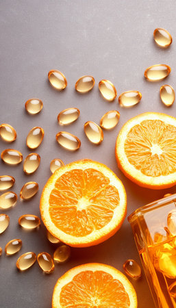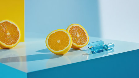 A visually striking composition featuring cut oranges and colorful capsules on a sleek surface, offering a fresh appeal ideal for health and wellness projects, emphasizing vibrant color and natural beauty.