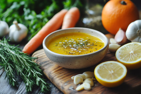 Creamy carrot and pumpkin soup seasoned with herbs and spices, surrounded by fresh ingredients, promoting healthy eating and autumn flavors