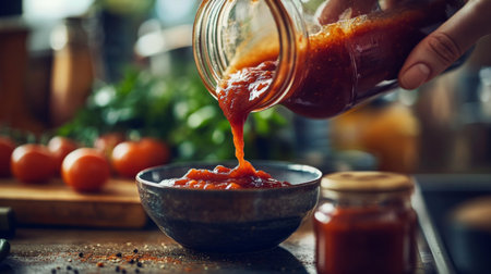 A close-up of homemade ketchup being poured from a jar into a small bowl, with fresh tomatoes and spices in the background, highlighting the artisanal process of making this sauce.